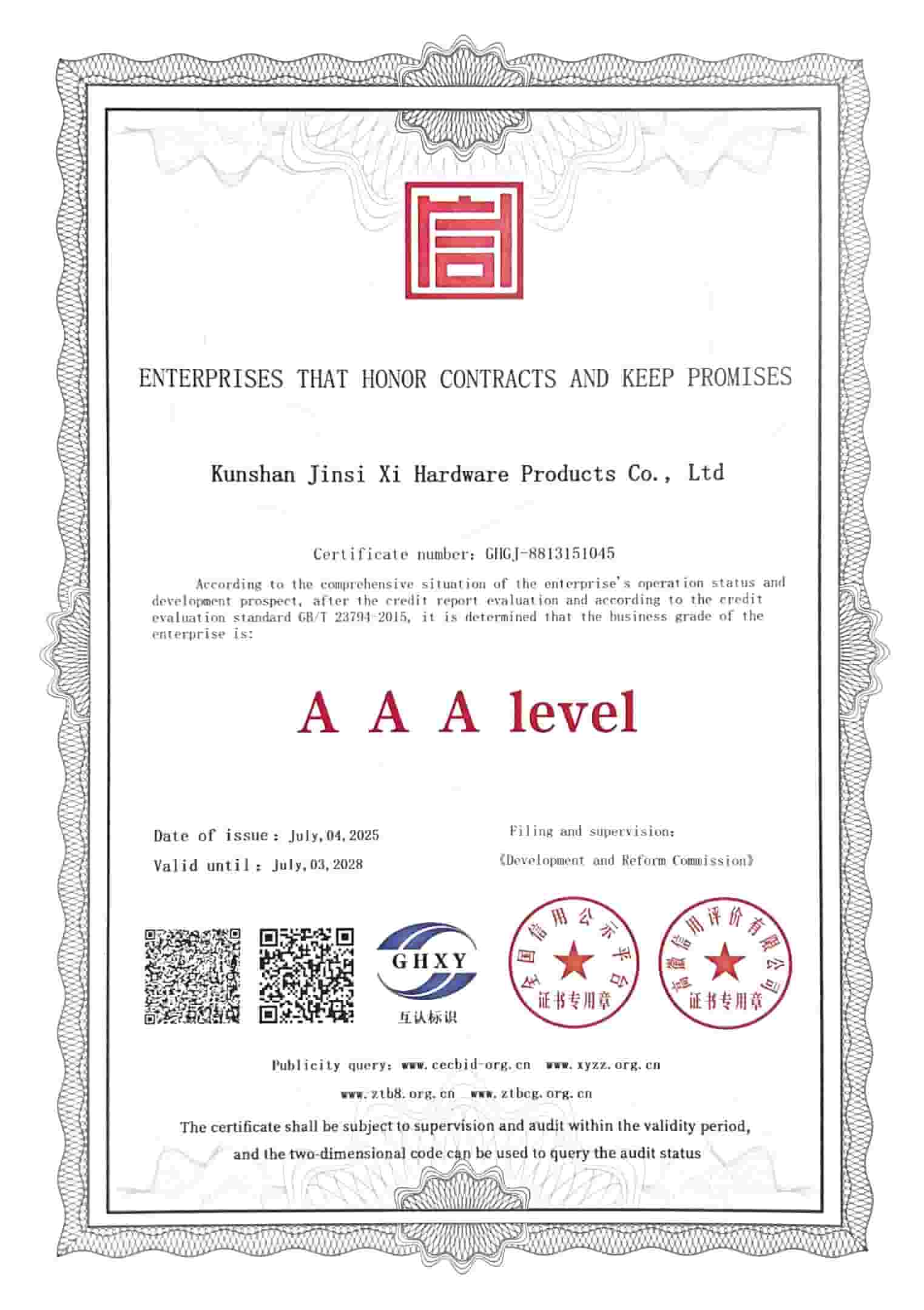 Kunshan JINSIXI Metalware Co., Ltd. has been officially awarded the title of " AAA level Enterprises that Honor Contracts and Keep Promises ". JINSIXI has always been adhering to the business philosophy of "unity and cooperation, diligence, pursuit of excellence and perfection", operating with integrity, providing customers with high-quality services, and ultimately achieving "perfect fulfillment".