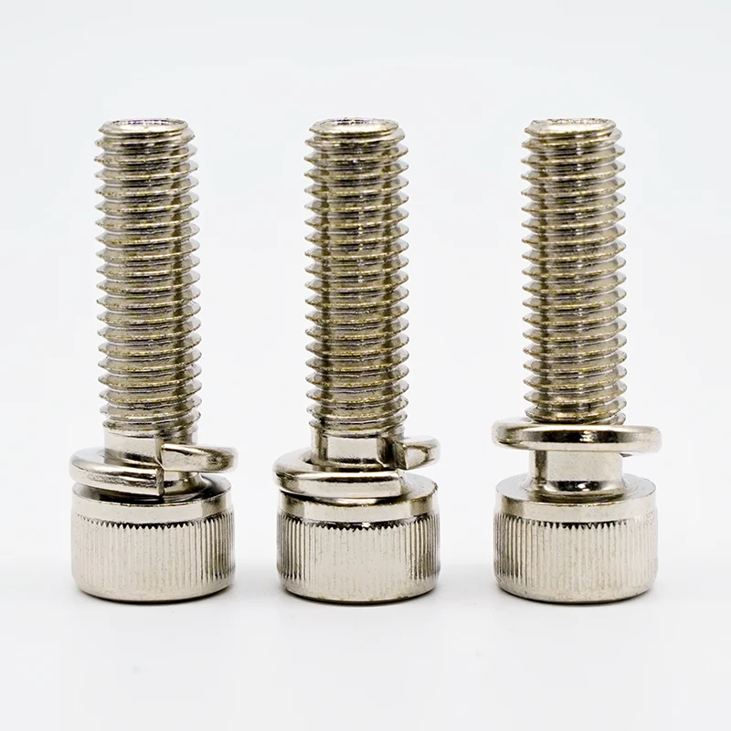 On automated assembly lines, using pre-assembled screws can significantly improve production efficiency, save labor hours, and reduce error rates. Our high-strength Nickel-plated Hex Socket Head Cap Screws with Spring Washers undergo hydrogen removal treatment, thus eliminating hydrogen embrittlement issues. Because they are pre-assembled and then electroplated, the screw, spring washers, and their contact points are all covered by the plating, forming a unified whole. The nickel plating provides good rust and corrosion resistance, with a uniform and bright appearance. When the two workpieces being connected are both hard, flat materials that are not sensitive to surface damage, Nickel-plated Hex Socket Head Cap Screws with Spring Washers effectively prevent loosening and enhance aesthetics. In scenarios requiring basic anti-loosening measures and prioritizing appearance, it provides an integrated solution.